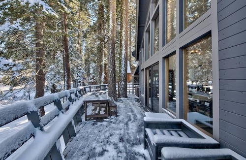 Amplio dormitorio de 5 habitaciones más altillo, 3 baños, bañera de hidromasaje, 6 televisores de alta definición, mesa de billar, chimenea, terraza envolvente con asientos, privacidad, 2. 5 millas del lago en Kings Beach en un vecindario tranquilo rodeado de bosques, senderos para caminatas y esquiar.