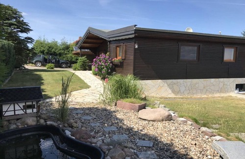 You can expect a beautiful wood holiday home with approx. 100 m² living space with bedroom (high double bed, TV with DVD, wardrobe, chest of drawers, safe), children's room (2 single beds, wardrobe, baby bed), living room (corner, table, smart TV 127cm Diameter, dining table with 5 chairs, kitchen and 1 bathroom with shower, bathtub and toilet as well as vanity. Baby equipment: staircase, high chair, baby bed, baby bath, potty, toilet seat, There is a Tassimo capsule machine in the house. In front of the holiday home is a covered terrace and a garden with a grill terrace and playground. There is also a small garden pond with goldfish and a carport. Attention wheelchair users: The house is at ground level, the entrance door is also wide enough for a wheelchair, unfortunately the doors in the house are only 69cm wide to the bathroom and bedroom.