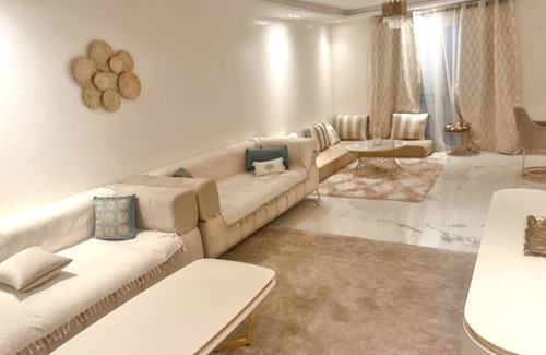 The living spaces on the ground floor are generous and bright, making them perfect for gathering. With multiple lounges, you can easily enjoy the flat-screen TV or relax on the sofa. The fully equipped kitchen, including an oven, microwave, and American fridge, is the ideal place to prepare your meals with ease.