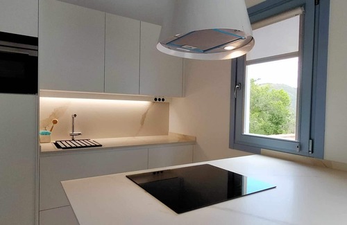 The kitchen has all the comforts of a large kitchen: a peninsula where you can cook while looking out over nature, and at the same time forming part of the activity of the living room and the terrace, and also where you can eat. The oven, fridge, dishwasher and crockery, designed for all kinds of occasions, complete the kitchen.