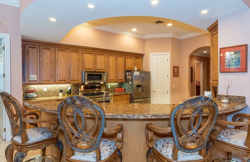 Las puertas dobles abiertas al vestíbulo principal con alza de 14 pies techos. Todas las habitaciones de una sola planta, sin escaleras ...! Desde la entrada principal que tendrá hermosa vista de habitación familiar a través de la piscina. Gran cocina abierta equipada con encimera de granito, cocina a gas, de lado a los hornos secundarios (1 grande, 1 pequeña) con controles independientes en cada uno, en virtud del gabinete del microondas, electrodomésticos de acero inoxidable, y un montón de espacio en el mostrador, ofrece un montón de espacio para 'gourmets 'para entretener y crear comidas fabulosas. Filtros de ósmosis inversa en el lugar para fregadero, máquina de hielo y el agua de la nevera. Un montón de asientos incluye una barra de bocadillos largo más asiento de la tabla en la zona de desayuno cocina. Asientos formales del comedor 10. Comedor cuenta con 18 pies techos que permiten enormes ventanas abiertas que proporciona mucha luz natural durante el día. A uno de los tipos importados lámpara de cristal de Murano de Venecia le da tiempo al ambiente la noche para cenas románticas que usted necesita!
