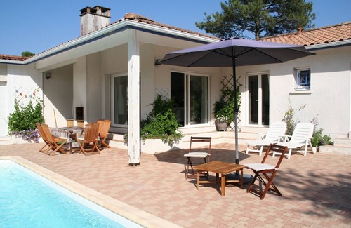 idílico jardín con una gran zona de la piscina, bonita decoración! | Casa en Lacanau Ocean