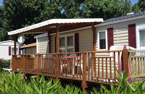 Privado de alquiler de casas móviles hermosa excelencia Categoría clasificada + no fumadores, aire acondicionado, terraza cubierta, 3 dormitorios con persianas, vestidor, área de descanso, con todas las comodidades, lavavajillas, TV, terraza y barbacoa en la playa de Vias 6/8 personas en camping 4 * en La Carabasse.