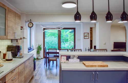 Esta acogedora casa de vacaciones en Pobiedziska impresiona por su diseño luminoso y su mobiliario de buen gusto, que crean de inmediato un ambiente agradable. En sus dos plantas podrá sentirse como en casa y relajarse. Cocinar, comer, jugar y relajarse juntos en las hermosas habitaciones de la casa.