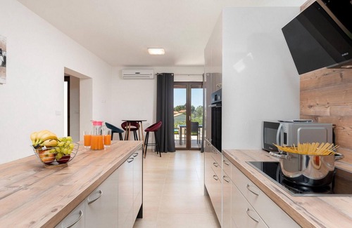 Bienvenido a Villa Re, un oasis de nueva construcción en el centro de Istria, a poca distancia en coche de la encantadora ciudad de Rovinj. Ubicada en una amplia parcela vallada de 800 metros cuadrados, esta villa cuenta con un cuidado césped, una piscina de agua cristalina para refrescantes chapuzones y una terraza cubierta donde podrá disfrutar de sus comidas en la mesa de comedor. La cocina de verano es perfecta para preparar deliciosos festines y hay dos plazas de aparcamiento a su disposición. En el encantador pueblo de Svetvincenat encontrará cafeterías, una pizzería y un supermercado para sus necesidades diarias, mientras que la playa más cercana está a sólo 17 km. Rovinj, con su pintoresco casco antiguo y sus impresionantes vistas de la costa, es una visita obligada durante su estancia. Villa Re es el refugio ideal para unas vacaciones inolvidables y relajantes.