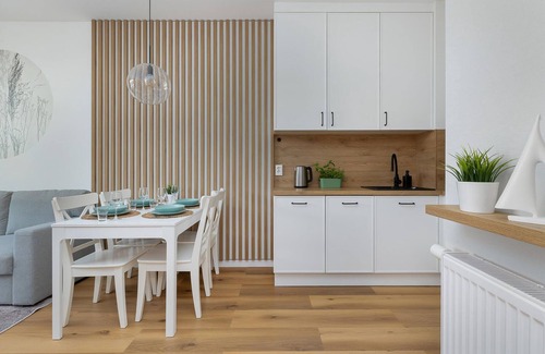 Pase sus próximas vacaciones en este elegante apartamento en Ustronie Morskie. Aquí no sólo le espera el confort moderno, sino también una ubicación céntrica cerca de la playa. El piso de vacaciones es luminoso y moderno y ofrece espacio para parejas o una familia pequeña. La zona de estar con un acogedor sofá y TV te invita a pasar tardes relajantes, mientras que la cocina abierta con comedor está idealmente equipada para comidas compartidas. Disfrute de su desayuno en el balcón con vistas a la vegetación. El mobiliario de buen gusto crea un ambiente cálido y acogedor.