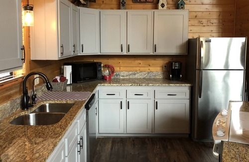 Esta casa de Cedar Creek está aislada y al final del camino. Es la escapada perfecta. La suite principal de arriba tiene una cama king y su propia terraza privada con vistas al bosque de abajo. La cubierta en el piso principal envuelve los dos lados de la casa. La tercera cubierta está debajo de un dosel de árboles y es lo suficientemente grande como para un almuerzo campestre. Las otras dos habitaciones están en el piso principal. La habitación "Oso" tiene una cama queen y televisión. La habitación "Moose" tiene una cama queen con una litera adicional. El salón está abierto a la cocina e incluye un televisor de 60 pulgadas sobre la chimenea. La mesa del comedor (con capacidad para 6-8) se encuentra debajo de un candelabro de asta. Los cuartos de baño son grandes y tienen un lavabo individual con bañera / ducha.