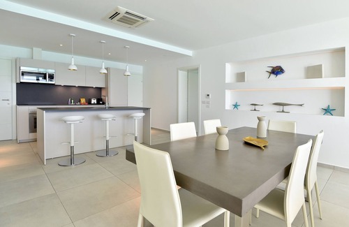 Este espacioso ambiente, diseñado para ser disfrutado en familia, tiene una terraza con impresionantes vistas al mar, piscina privada, dos master suites (una con una cama king y un vestidor), la otra con dos camas dobles (puede unirse ellos y hacer una cama king) y armario y una tercera habitación con sofá cama.