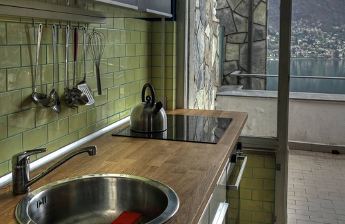 Impresionantes vistas al lago de Lugano, la parte superior apartamento con una terraza enorme (20 m²), salón-comedor (45 m²) y comedor con sofá-cama doble, TV-Sat CD Pl Nueva cocina (placa de inducción, lavavajillas, horno, Lav cafetera. A modo mio), cuarto de baño con bañera, garaje con bicicletas, barcos, tablas de surf, etc. Playa con césped, para relajarse en la soleada días, Ticino verde y Lombardía (Italia).