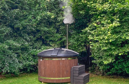 Quédate en la terraza cubierta y pon la mesa para comer juntos al aire libre. Utiliza la barbacoa de la terraza de madera, pon los pies en la hamaca y déjate envolver por la tranquilidad del jardín. Descubre las pequeñas zonas para sentarse entre la vegetación y pasa horas de relax con una taza de café. Refrésquese en la bañera finlandesa de madera y disfrute de acogedoras veladas al aire libre.