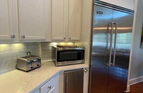 Propiedad de un ejecutivo de restaurante y su esposa diseñadora y su familia, esta espaciosa casa cuenta con una cocina profesional equipada con vikingos y con todas las herramientas que necesitará para unas excelentes vacaciones. Hay una cafetera Keurig q te mantiene con cafeína y una máquina para hacer hielo debajo de la barra incorporada en la cocina. Dos sistemas de aire acondicionado para cada lado de la casa, por lo que no se puede pelear por la temperatura, la chimenea, los cómodos espacios de estar, la mesa de comedor antigua para diez, pero con espacio para 12, el porche cubierto con vista al arroyo de marea y la marisma abriéndose a dos cubiertas abiertas y Un muelle privado para que disfrutes tu café de la mañana. Por supuesto, incluimos nuestro carrito de golf para que te muevas y nuestros dos kayaks de mar para divertirte remando.