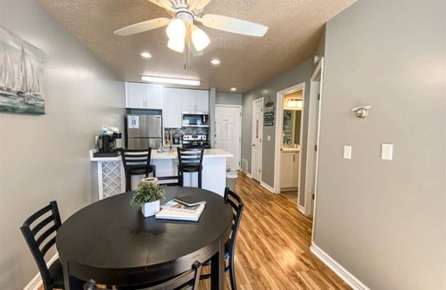 Magnífico condominio Queen actualizado de 1 habitación con cocina completa, comedor y sala familiar con sofá cama Queen, en el segundo nivel, ubicado en Harbor Village. Duerme 4 en camas. Las comodidades de WiFi gratis incluyen; microondas, lavavajillas, chimenea de gas, aire acondicionado, TV de pantalla plana con cable y DVD, parrilla, cocina surtida, comedor, piscina climatizada al aire libre de temporada, canchas de tenis, canchas de baloncesto, senderos para caminar, a poca distancia de Marina y más