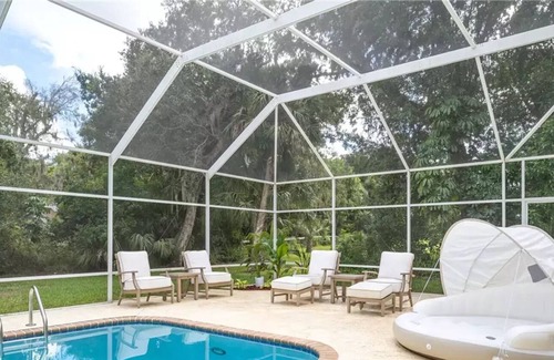 The huge screened in pool area has plenty of seating for enjoying the sun, a table for 6, pool toys and rafts to enjoy the heated pool and a gas grill for poolside cookouts. Solar tiki torches and a pool light keep it festive into the evening.