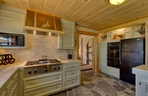 Con impresionantes vistas del pintoresco lago Tahoe y puertas y molduras de troncos pintadas a mano por un artista local, la impresionante cocina incluye asientos para cuatro personas en la barra de desayuno, una estufa a gas Thermador, hornos dobles, un complemento completo de utensilios de cocina, todo lo que necesita para Crea comidas caseras. El lavavajillas facilita la limpieza.