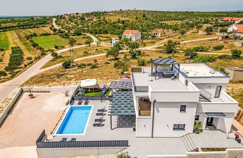Tinj 12 km from Biograd na Moru: Modern villa "Katarina", 2 storeys, built in 2021. In a quiet, sunny, elevated position, 13 km from the sea. Private: property 700 m2 (fenced), swimming pool angular (8 x 4 m, depth 150 cm, seasonal availability: 01.May. - 31.Oct.) with internal staircase. Outdoor shower, hot tub, table tennis, terrace (50 m2), garden furniture, barbecue, children's playground (slide, swing). In the house: internet access, trampoline, washing machine. Parking (for 4 cars) at the house on the premises. Shop 1 km, restaurant 12 km, pebble beach 13 km. Tennis 12 km. Nearby attractions: Amusement park 17 km.