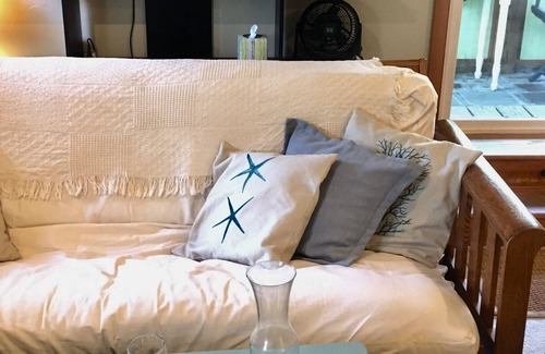 Sala de estar con sofá cama futón de tamaño completo, internet inalámbrico, TV de pantalla plana con reproductor de DVD; no hay servicio de cable, pero los usuarios de iPad y otros dispositivos pueden transmitir a este televisor a través de Chromecast.