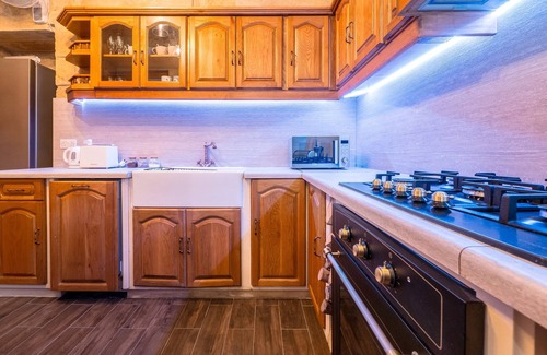 En la planta baja se encuentra la sala de estar con un sofá cama y una televisión inteligente, luego 3 escalones más arriba es una cocina tradicional maltesa, un área para fumadores y un baño.