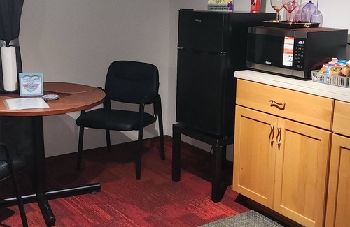 A small kitchenette/coffee bar is provided, where guests can heat and refrigerate food in this Majestic Master Suite Room. There's a microwave/air fryer, keurig coffee maker, tea kettle, mini fridge....