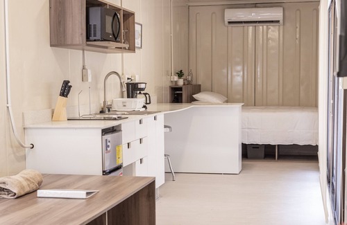 Immerse yourself in a sustainable retreat crafted from repurposed containers, providing fully-equipped top-tier accommodations just 100 feet from the ocean.