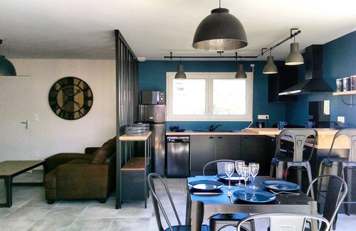 La casa (85 m²) con el estilo industrial actual deco, de una sola planta, sin terrazas, accesible para personas con movilidad reducida, consta de 2 dormitorios (1 con 1 cama doble de 160 y TV de pantalla plana y 1 con 2 camas individuales) : todas las bases de cama son nuevas, al igual que los colchones en forma de memoria), un baño con cabina de ducha y secador de toallas, una amplia sala de estar con la sala de estar, televisor de pantalla plana (106 cm) y la estufa, una cocina abierta totalmente equipada (lavavajillas, microondas, vitrocerámica, horno, campana extractora, tostadora, hervidor, café tradicional y Senseo, nevera-congelador, ...).