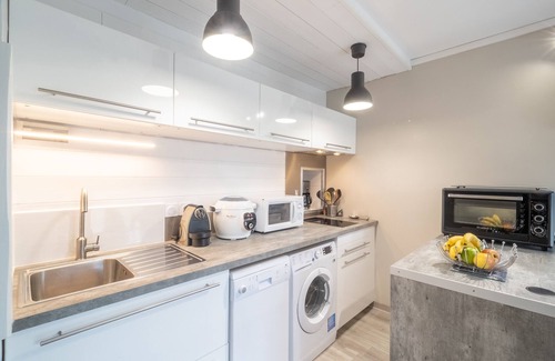 Prepara una comida casera en la cocina, equipada con horno, frigorífico y lavavajillas, además de cafetera y tetera, microondas y utensilios de cocina. Disfruta del wifi gratis, de la televisión y del reproductor de DVD. No necesitarás llevarte mucho equipaje, porque hay una lavadora. Otras comodidades de este alojamiento de 1 dormitorio y 1 baño incluyen una sala de estar, una tabla de planchar, calefacción y una mesa de comedor.