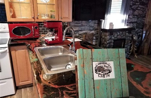 En el interior se siente como una cabaña de montaña de Yellowstone, relájese frente a la chimenea eléctrica o juegue dominó con su pareja.