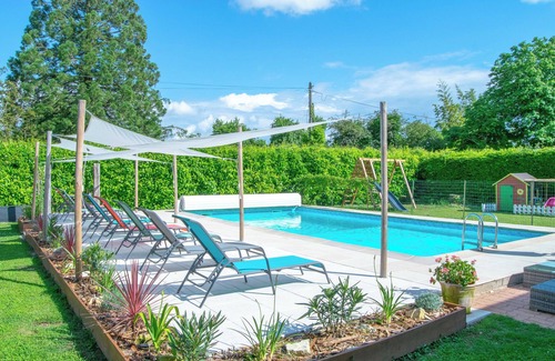 La gran piscina climatizada está rodeada por una zona de césped aislada para tomar el sol. El área de la piscina está vallada para la seguridad de los niños y cuenta con tumbonas, zonas para sentarse y comer al aire libre con una segunda barbacoa.Al lado de la piscina hay un área de juegos para niños completa con una casa Wendy y un columpio y tobogán para mantener entretenidos a los más pequeños mientras usted se relaja junto a la piscina.