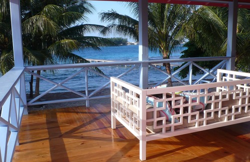 Ubicado a sólo 70 pies de las aguas borde de la casa tiene vistas panorámicas de la playa privada, océano, los cayos de Utila y la montaña Pico Bonito de Honduras de la parte continental en el horizonte.