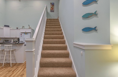 Hay cinco dormitorios y 3. 5 baños. Una cama principal / baño se encuentra en el piso principal, junto con un medio baño adicional fuera de la cocina. Arriba hay 2 dormitorios y 1 baño completo. En la planta baja, hay otros 750 pies cuadrados de espacio habitable en la planta baja con un dormitorio, baño completo, sala de niños / sala de juegos con literas y una segunda sala familiar con TV de 65 pulgadas y cocina. Esta casa vive bien!