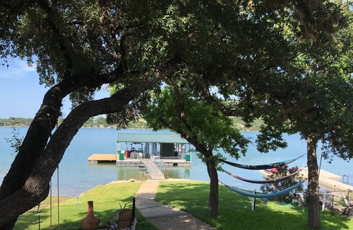 Enjoy wonderful sunsets on this newly renovated property located on Medina Lake. It includes a private dock with a sound system, where you can bring your water toys, swim and fish. Although the lake is down, we are still in deep water. A golf cart isw part of the rental to assist in going to and from the dock. There are public boat ramps for your use at Red's Cove, Joe's Place and the County Park on Park Road 37. They are within 10 - 17 miles of our home by car and, as a bird flies, they are just about a mile away from our dock. Although the lake level is fluctuating, our dock is still in deep water. In the main house there are 4 bedrooms and 2.5 bathrooms, the master with its own private bath and gorgeous walk in shower. There is a game room and loft, but the kitchen view steals the show. The kitchen boasts large windows with a more than 200 degree view of the lake. The large deck off the kitchen is a perfect spot for morning coffee with a lakeview or a glass of wine with a sunset. There is something for guests of every age to enjoy, perfect for celebrating holidays or having a reunion. The loft is a great getaway for kids, while the game room has a pool table, electronic dart game, a new classic table top video game with all of the games you remember...from Frogger to Mario to Pacman. Outside there is a new cornhole game, a chiminea for fires and roasting marshmallows for s'mores. The dock is covered and has the ability to tie on two boats and there is an electric ramp for either parking jet ski's or easy access to swim. (great for children). The lake levels fluctuate, however our dock is in an average of 8 feet of water at any particular time. The family room has a 70" tv and a home sound system throughout the kitchen, family room and game room with volume controls in each room. The home is equipped with wifi, new wifi printer (if you need to work from 'home') and numerous dvd's, and board games. The base nightly rate is for 1-8 guests, however it can sleep 16. You will need to contact the owner for parties over 8. There is an optional detached bunk room that sleeps 4 adults + 1 child, which is perfect to create some separation, especially useful for those who have a baby or elders who want a quiet place to escape. You may add the bunk room for an additional fee depending on the season. Contact owner for details. Home is equipped charging outlet 14-50r for your RV, Tesla, electric vehicle, etc. This is a FAMILY vacation destination.