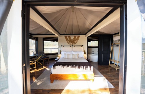 Lake Front Luxury Safari Tent: Hot Tub, TV, & Soaking Tub | Complejo en Cedar Bluff