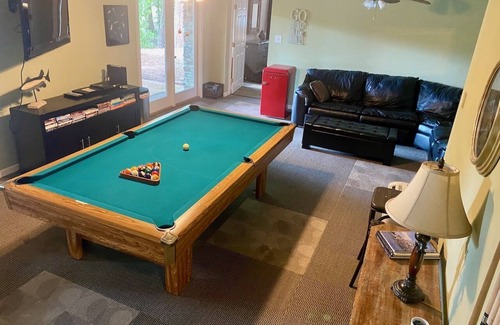SÓTANO: tiene una mesa de billar con una mesa de ping pong convertible, TV de pantalla plana grande, DVD Blu-ray, sección de cuero grande, 1 dormitorio, baño completo y lavandería. El dormitorio tiene una cama king-size.