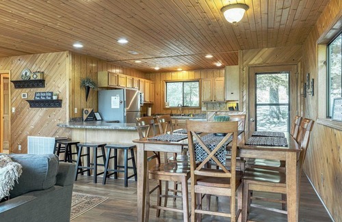 Inside, the spacious open living room features a cozy stone fireplace, ideal for chilly fall and winter nights. Outdoors, gather around the fire pit day or night to enjoy the crisp air and starlit skies. The main level offers a fully stocked kitchen with all the essentials for cooking meals for the entire group. A breakfast bar provides a spot for casual dining, while a large dining table invites you to enjoy meals together. The master suite, located on the main level, features a comfortable king bed for ultimate relaxation.