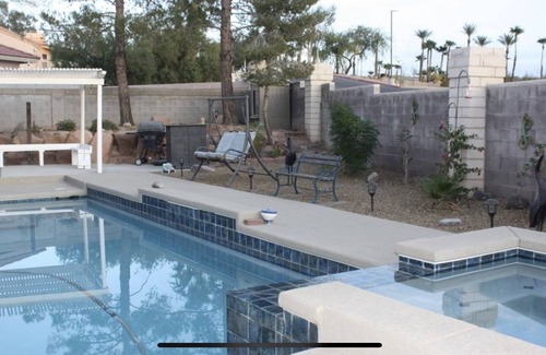 Beautiful and spacious house over 3,000 sq ft house in quiet neighborhood between Tuscany and Lake Las Vegas. If your looking for a lot of space close to Lake Mead this is it! Heated upool and spa, huge yard with two outside patios and two pool seating areas and a long driveway on one side of the house perfect for boat parking. Big bed rooms and a living room, family room, dining room and loft/game room with balcony and view of Las Vegas lights. Delightful neighborhood with great bike and walking trails nearby. Water softener, reverse osmosis in kitchen for drinking water at hand, extra freezer, many conveniences. Air hockey table and games in game room.