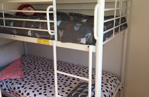 Ambas habitaciones tienen una cama queen size, TV / reproductor de DVD, armario, cajones y aire acondicionado / calefacción. El dormitorio dos está a la vuelta de la esquina de las salas de estar, mientras que el dormitorio uno está junto a la cocina. Al final del pasillo, hay un área que llamamos el 'rincón'. Tiene una litera, adecuada para 2 niños, justo afuera de la puerta del dormitorio 1.
