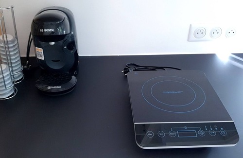 Prepara una comida casera en la cocina, equipada con placa de cocina, frigorífico y lavavajillas, además de cafetera y tetera, hervidor eléctrico y microondas.