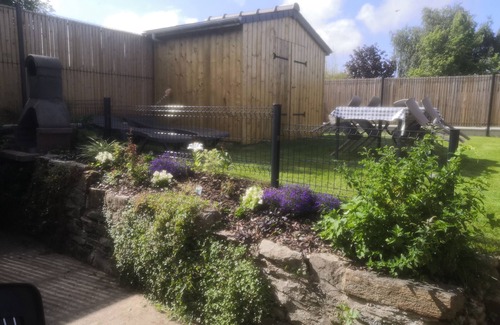 Terreno cercado detrás de la casa (baños de sol, muebles de jardín (adultos y niños), barbacoa de piedra, caseta de jardín, cajón de arena.