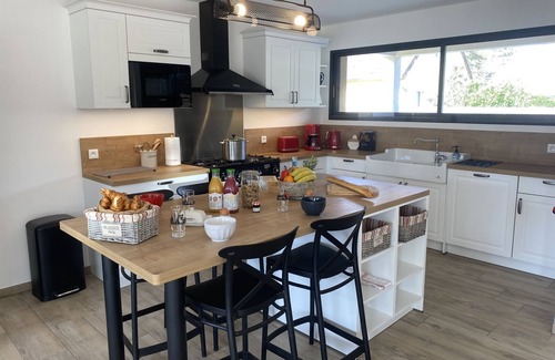 "Les lilas", casa 6 estancias 120 m2 en 2 plantas. Con mobiliario confortable y moderno: salón-comedor con TV (pantalla plana). Salida a la terraza. 1 dorm. con 1 cama doble (140 cm, 190 cm de longitud). 1 dorm. con 2 camas (90 cm, 200 cm de longitud) con WC separado. Cocina abierta (horno, lavavajillas, tostadora, hervidor de agua eléctrico, microondas, congelador, cafetera eléctrica). Baño/WC. Calefacción por el suelo. Planta superior: 1 dorm grande con 3 camas (90 cm, 190 cm de longitud). 1 dorm. con 1 cama de matrimonio (160 cm, 200 cm de longitud). 1 dorm. con 2 camas (80 cm, 200 cm de longitud). Baño/ducha, WC separado. Terraza grande 50 m2, orientación sur y orientación oeste. Muebles de terraza, barbacoa, tumbonas. Vista al mar. El alojamiento dispone de: lavadora, secadora. Internet (Módem, gratis). A tener en cuenta: 1 mascota / perro. Detector de humo. Oferta de un propietario comercial según el art. 155, IV, CGI
