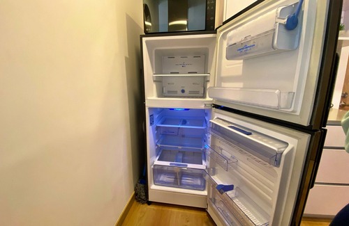 El apartamento cuenta con nevera grande, microondas,