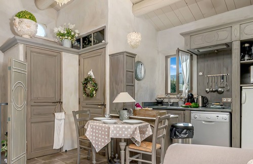 Los exteriores de la residencia están magníficamente acondicionados para ofrecerte una auténtica experiencia provenzal. Encontrarás zonas con sombra, pérgolas, cortinas blancas, plátanos y bancos de piedra para relajarte. Hay una barbacoa de carbón disponible, y puedes comprar el carbón en un supermercado cercano. La vegetación típicamente provenzal, compuesta por olivos centenarios, retamas, adelfas y lavandas, crea una atmósfera encantadora. Una fuente y un campanario añaden aún más encanto al conjunto.