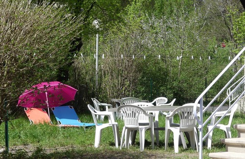 Un gran jardín con mesas y sillas te espera para disfrutar de excelentes barbacoas.