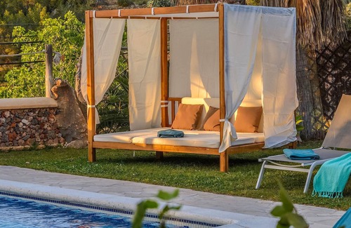 Piscina de 11m x 5m. Cama balinesa y tumbonas, hay muchos árboles que dan sombra y una hermosa vista donde se puede ver la iglesia de San Miguel y el mar al fondo.