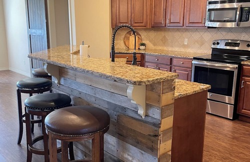 Welcome to Lubbock Landing! Your Lubbock adventure begins at this lovely 3-bedroom house in the beautiful North Pointe neighborhood. The master bedroom has a queen bed and a futon sofa that pulls down to a wonderfully comfortable full bed, as well as a large en-suite bathroom with granite counters, two sinks, separate tub and shower, and large walk in closet that also has a desk. This room also has a large wall-mounted TV where you can stream the shows of your choice. The second and third bedrooms each have a full size bed and upgraded linens. There is a second bath with a tub/shower combo and granite counters. The beautiful, fully-stocked kitchen has granite counters and a bar island that seats four. The dining room seats an additional four. The spacious living room can seat 7 and has a large TV for streaming shows. The beautiful back yard has a covered patio and a large deck with seating for six. There is available parking for one car in the garage, two in the driveway and street parking. Other amenities include: WiFi, hair dryers, and a washer/dryer. We hope you choose to stay at our home away from home in the “806” and make some great memories!