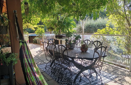 Terraza bajo pérgola equipada para disfrutar de la mañana, el mediodía y la tarde en el calor provenzal