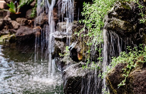 Al entrar a Hale Wailele, son recibidos por magníficos estanques de koi y el sonido de cascadas en su patio privado.