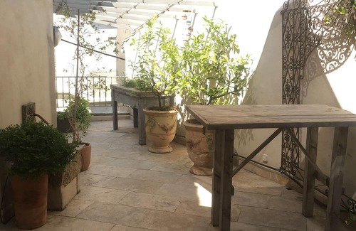 Terraza privada de 20m2 con vistas a la plaza de la iglesia y al río Sorgue.
