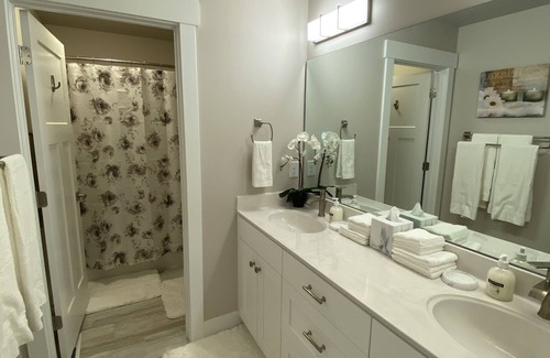 En esta nueva casa, tendrá acceso a un amplio 1,600 pies cuadrados que comienza con un garaje, estacionamiento y entrada privada. El dormitorio principal y un dormitorio de invitados tienen hermosas camas King, y el segundo dormitorio de invitados contiene literas queen sobre queen, todas con hermosas y lujosas sábanas, almohadas y mantas. Cada habitación tiene su propio armario y TV inteligente de 55 ", junto con un televisor adicional de 65" en la sala de estar. Los baños están equipados con jabones, toallas y secador de pelo.