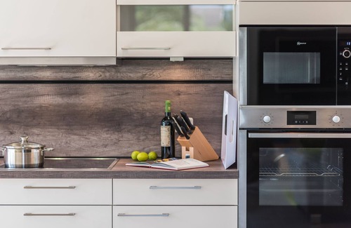 La cocina está totalmente integrada en la sala de estar y comedor, cocina totalmente equipada con equipo de alta calidad (cocina de inducción de 4 zonas, horno de convección, microondas, lavavajillas, nevera-congelador, cafetera, tostadora, hervidor, platos de alta calidad, vasos, ollas, sartenes y varios pequeños inventarios útiles no dejan nada que desear. Además, hay disponible una máquina Nespresso (cápsulas, por favor traer). Aquí puede brindarse lo mejor para su corazón y decidir qué delicias completan su estadía. Además, una despensa independiente está disponible.