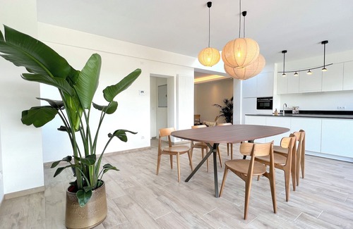 La cocina está equipada con placa de cocina, frigorífico y lavavajillas, además de cafetera y tetera y microondas. Y gracias a la lavadora y la secadora, podrás viajar con poco equipaje. Otras comodidades incluyen una sala de estar y una tabla de planchar.