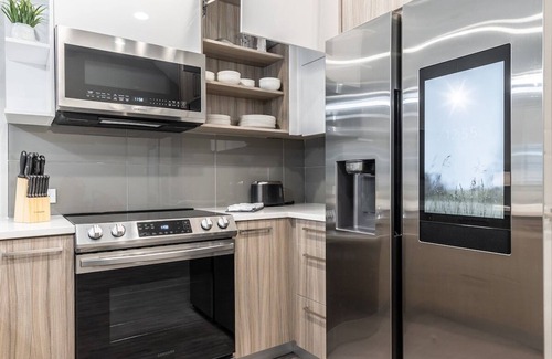 Este alojamiento de 2 dormitorios y 2.5 baños cuenta con una sala de estar, aire acondicionado, escritorio y servicio local de entrega de comida. Conéctate al wifi, o relájate frente a un Smart TV. El cuarto de baño incluye un secador de pelo y toallas. La cocina está equipada con horno, placa de cocina y frigorífico, además de cafetera y tetera, microondas y utensilios de cocina. Y como podrás aprovechar la lavadora y la secadora, no te hará falta llevar mucho equipaje. Otras comodidades incluyen ropa de cama, una tabla de planchar, calefacción y una mesa de comedor.